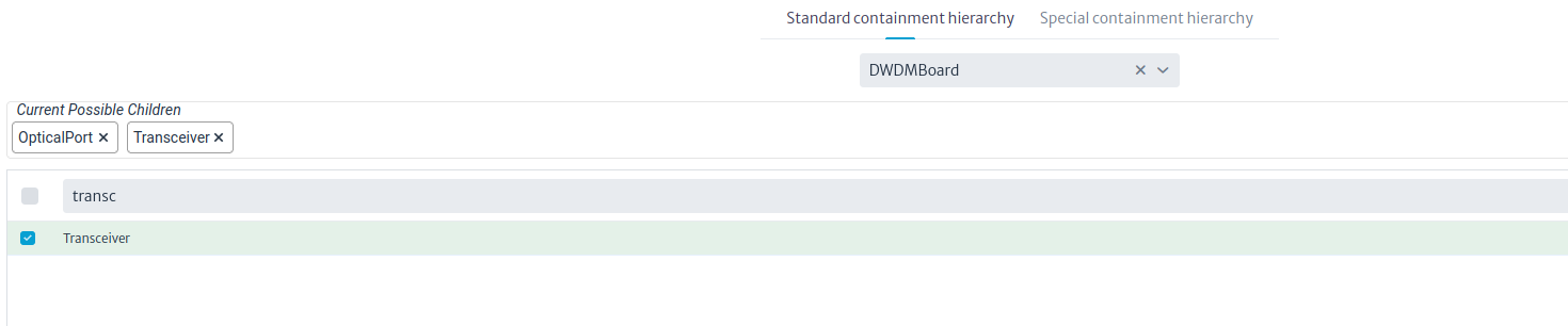 Set the default attribute values in the property sheet on the right. For this example, we had previously created a Huawei OSN1800 V entry in the EquipmentModel list type. To create the slots, use the "+" button next to your new template. Choose single or multiple according to your needs. If you chose multiple, use a pattern as instructed in the user manual. The inner elements are created from the "..." menu next to the parent object. In this example, we will create a control board in the first slot, and communications boards with single ports in the next 2.
